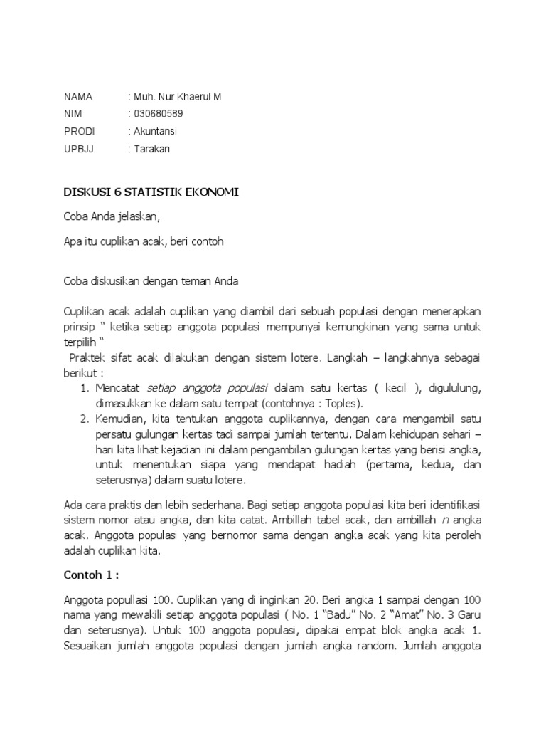 Cuplikan Acak Kholid Arifin Academia Edu from 0.academia-photos.com Dengan dasar dua momen ini akan di normalakan. Dari 240 komponen hasil produksi yang diambil secara acak, terdapat 20 komponen cacat, maka probabilitas cacat : Probabilitas dilambangkan dengan p contoh 1: Setiap anggota cuplikan adalah variabel yang memiliki distribusi probabilitas yang sama , yang sama juga dengan distribusi populasi. Fungsi probabilitas kumulatif variabel acak kontinu kalau pada variabel acak diskrit, fungsi probabilitas kumulatif dihitung dengan cara penjumlahan maka pada variabel acak kontinu, probabilitas kumulatif dicari dengan integral. Probabilitas dapat juga diartikan sebagai harga angka yang menunjukkan seberapa besar kemungkinan suatu peristiwa terjadi, di antara keseluruhan peristiwa yang mungkin terjadi. (perhitungan menggunakan dua angka desimal, dan diketahui pr(z<0,1) = 0,4602, gambar pr(z<1,66) = 0,485, pr(z > 4) = 0,00). Berapa besar probabilitas bahawa seorang pelajar yang secara acak akan mendapatkan nilai di atas 80.